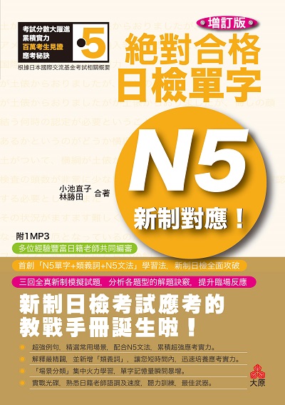 配合新制日檢,史上最強的日檢N5單字集《新制對應 絕對合格!日檢單字N5》,根據日本國際交流基金(JAPAN FOUNDATION)舊制考試基準及新發表的「新日本語能力試驗相關概要」,加以編寫彙整而成的。除此之外,根據最新日檢考試內容,更添增過去未收錄的生活常用必考單字項目,內容最紮實。無論是累積應考實力,或是考前迅速總複習,都是您最完整的學習方案。